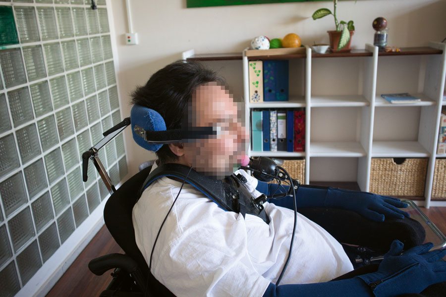 - die Nutzung von Mund/Kinn/Sprache etc. zur Steuerung des Umfeldes bzw. eines Elektrorollstuhls bei vollständigem Funktionsverlust der Arme (Abb. 1).