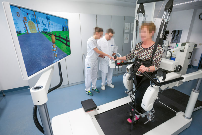 Die Geräteauswahl richtet sich nach dem Allgemeinzustand und der neurologischen Situation der Patienten. Sollte zu Beginn der Behandlung eine Aufrichtung in die aufrechte Position beispielsweise aufgrund von Kreislaufproblemen noch nicht möglich sein, kommt in der Klinik der Autoren der Erigo® (Abb. 2) zum Einsatz. Ist der Kreislauf stabil, bestehen aber höhergradige Lähmungen, wird das Gehtraining auf dem Lokomat® (Abb. 3) begonnen. Wenn Gewichtsentlastung und Beinführung reduziert werden können, wird zunehmend auf dem Laufband sowie am Barren und über Grund trainiert.