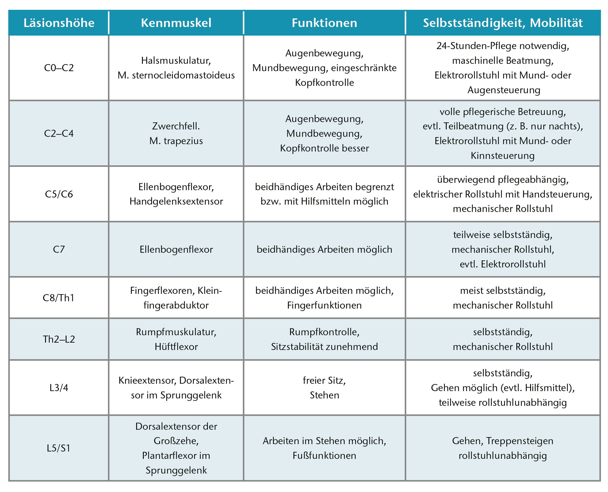 Je nach Verlauf wird der Behandlungsplan immer wieder angepasst, aktualisiert und ergänzt. Die erreichbare Selbstständigkeit ist dabei abhängig von der Höhe und der Schwere der Läsion (Tab. 1).