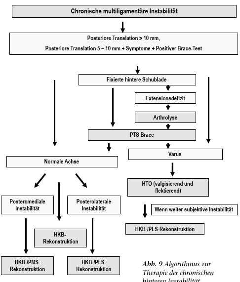 Die Rehabilitation multiligamentärer Eingriffe richtet sich immer nach dem hinteren Kreuzband, sofern es betroffen ist. Dem Patienten wird 6 Wochen lang eine gerade Knieschiene mit einem Wadenpolster (z. B. PTS Brace, Medi, Bayreuth) in Streckstellung angelegt 66. In Streckung zieht der Zug der ischiokruralen Muskulatur die Tibia nicht nach hinten. Außerdem kommt es durch die physiologische Sagittalneigung in Streckung unter Last eher zu einer anterioren Verlagerung der Tibia 67. Der PTS Brace besitzt außerdem ein Polster, das die Wade im Liegen unterstützen soll. Damit soll der Schwerkraft im Liegen entgegengewirkt werden. Bewegungsübungen sollen in den ersten 6 Wochen nur passiv in Bauchlage erfolgen. Nach 6 Wochen wird dem Patienten eine bewegliche Knieorthese angelegt. Der PTS Brace wird dann für weitere 6 Wochen nur noch zur Nacht getragen. Abbildung 9 zeigt einen diagnostischen und therapeutischen Algorithmus zur Behandlung der chronischen multiligamentären Instabilität.