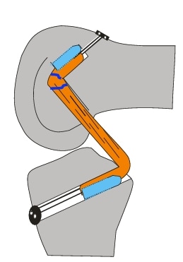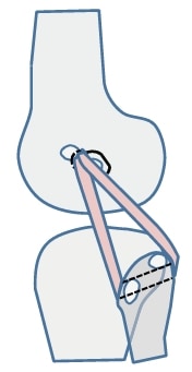 Beim eigenen Vorgehen hat sich die isometrische Rekonstruktionstechnik nach Larson bewährt (Abb. 7) 56. Dabei werden die posterolateralen Strukturen mit einem autologen Sehnentransplantat ersetzt, das durch ein Bohrloch in der Fibula gezogen wird. Es wird die Ansatzsehne des M. semitendinosus der Gegenseite als Transplantat verwendet. Der vordere Transplantatschenkel soll das laterale Kollateralband ersetzen, der hintere Transplantatschenkel den Popliteuskomplex. Beide Transplantatschenkel werden im Bereich des Epicondylus lateralis mit einer Interferenzschraube (z. B. Megafix P, Karl Storz, Tuttlingen) fixiert. Die Fixation erfolgt in 70° Beugung, bevor das HKB-Transplantat fixiert wird.