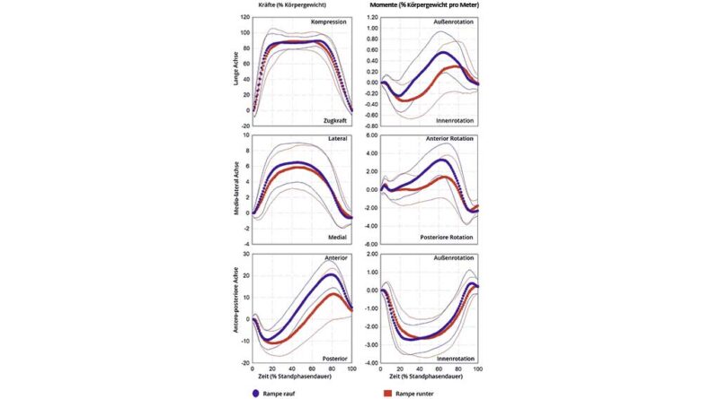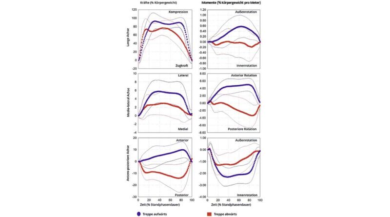 Einen Überblick über den Mittelwert und die Standardabweichung der auf das Implantat einwirkenden Belastung während der Stützphase beim Gehen bzw. beim Treppen-/Rampenauf- und ‑abstieg geben die Abbildungen 1–3.