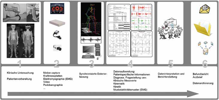 Eine vielseitige diagnostische Methode zur Therapieentscheidung und Verlaufskontrolle bei komplexen Gangstörungen ist die instrumentelle dreidimensionale markerbasierte Ganganalyse. Typische Patienten für eine Ganganalyse sind Patienten mit Zerebralparese oder sonstigen neurologischen und orthopädischen Pathologien. Es können neben Zeit-Raum-Parametern wie Ganggeschwindigkeit, Schrittlänge, Schrittdauer und Schrittfrequenz auch Gelenkwinkelstellungen beim Gehen (Kinematik), deren Momente und Leistungen (Kinetik) sowie Muskelaktivitäten (mittels Elektromyographie) erfasst werden. Eine klinische Indikation mit gezielter Fragestellung wird meist bereits in der ärztlichen Sprechstunde festgelegt. Beim Besuch im Ganglabor folgen dann Datenerhebung, Datenauswertung und Berichtgebung (Abb. 1).