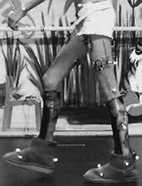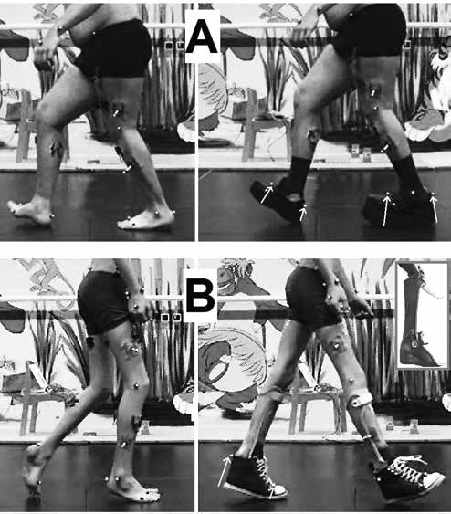 Eine ähnliche Situation entsteht beim Tragen von Fuß- oder Unterschenkelorthesen und/oder Schuhen. Es ist meist nicht möglich, die Marker im Bereich des Hilfsmittels direkt auf die Haut zu kleben. Sie werden stattdessen auf den Schuhen oder Orthesen befestigt. Damit entsteht eine gewisse Messungenauigkeit bei der Bestimmung der Gelenkmittelpunkte und der Bewegungsachsen. Die zwei größten Fehlerquellen bei allen Ganganalysen mit Orthesen und/oder Schuhen sind allerdings einerseits die Position bzw. die Bewegung des Fußes in der Orthese oder dem Schuh und andererseits die Bewegungen zwischen Orthese und Schuh. In der Regel wird über die Markerplatzierung die Bewegung des Schuhs und/oder der Orthese und nicht des Fußes zum angrenzenden Körpersegment bestimmt. Wenn Schuh und/oder Orthese nicht richtig passen, ist die Bewegungsanalyse fehlerhaft. Dies ist deutlich in Abbildung 3 und 4 ersichtlich: Der offensichtliche Fehler in Abbildung 4 ist zu vermeiden, wenn beim Patienten Orthesen und Schuhe als Einheit betrachtet werden können. Das Gesamtkonzept muss stimmen und als Einheit funktionieren.
