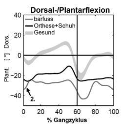 Die Biomechanik des Gehens mit Orthesen und/oder Schuhen kann durch eine instrumentelle dreidimensionale markerbasierte Ganganalyse ermittelt werden. Dabei sind gewisse Überlegungen zu berücksichtigen: Marker auf den Orthesen und/oder Schuhen anstatt direkt auf der Haut führen zu Fehlern in der Kinematik. Weiter kann die Ungewissheit über Fußstellung und Fußbewegung in der Orthese respektive im Schuh zu unrealistischen Daten führen. Wo Orthesen die Haut bedecken, kann von den Muskeln keine Elektromyographie abgeleitet werden, und das Aktivitätsmuster bestimmter Muskeln fehlt. Zudem muss berücksichtigt werden, dass reflektierende Stellen am Schuh abgedeckt werden, um Reflexionen und Markervertauschungen bei der Aufnahme zu vermeiden. Wichtig ist auch zu wissen, dass die Ganggeschwindigkeit mit Orthesen und/oder Schuhen im Vergleich zum Barfußgehen verändert sein kann, wodurch bestimmte Gangparameter beeinflusst werden. Allerdings kann festgestellt werden, dass das Gewicht der Orthese und/oder des Schuhs sowie der geänderte Segmentmassenschwerpunkt für die Kinetik in der Standphase vernachlässigt werden können.
