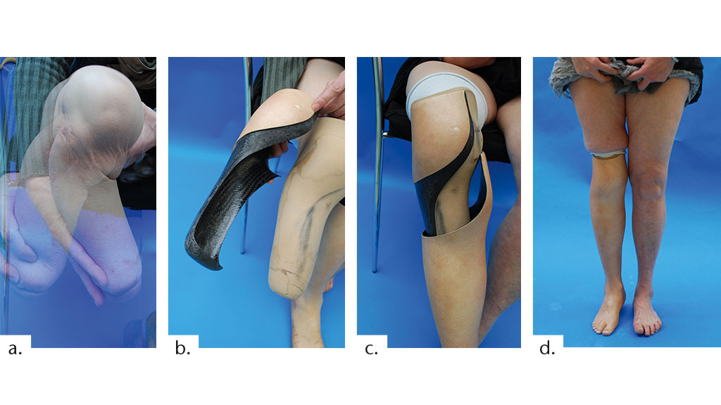 Bei der heute 56-jährigen Patientin zeigt sich eine Gliedmaßenfehlbildung in Form eines angeborenen Unterschenkelstumpfs mit fehlender Tibia. Das vorhandene Wadenbein wurde kurz nach der Geburt operativ distal unter dem Femur platziert. Dabei ist die Fibula sehr kurz, sodass sich der Stumpf als sehr weiche, verschiebliche Masse darstellt. Aus der Dysmelie ergibt sich, dass kein Tibiaplateau vorhanden ist und keine Bänder das Knie stabilisieren – Stabilisation und Führung erfolgen einzig über die Muskulatur, was eine sehr große, nicht kontrollierbare Beweglichkeit in der Frontalebene ergibt (Abb. 1a). Die Verfasser entschieden sich zur Lösung dieses Problems für eine klassische Versorgung mit Softsocket, denn mit einem Standardliner oder einem Liner nach Maß wäre das Anziehen sehr schwierig, da der Stumpf beim Versuch, den Liner über den Stumpf zu rollen, immer wieder wegkippen würde. Über den Softsocket wird zunächst eine steife innere Schale gezogen, die die Weichteile des Stumpfes bis oberhalb des lateralen Kondylus stabilisiert (Abb. 1b). Mit dieser inneren Schale steigt die Patientin in den äußeren Schaft, der die Kondylen in gewohnter Weise von medial übergreift und in Verbindung mit der inneren Schale das Knie seitlich stabilisiert. Durch diese Zwei-Schalen-Technik wird das Handling der Prothese erheblich erleichtert (Abb. 1c), da der Stumpf in der Einstiegsrichtung stabilisiert ist. Zudem war dadurch viel weniger Ausgleich am Softsocket nötig, was zu einer schlankeren Kosmetik im Kniebereich führte. Mit dieser gelungenen Kosmetik fühlt sich die Patientin nach eigener Auskunft wieder „richtig wohl“ (Abb. 1d), und die gelungene Fixierung des Knies erlaubt ihr darüber hinaus wieder ein sicheres (und selbstsicheres) Gehen im Alltag.