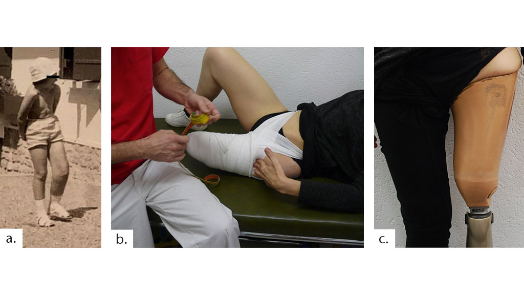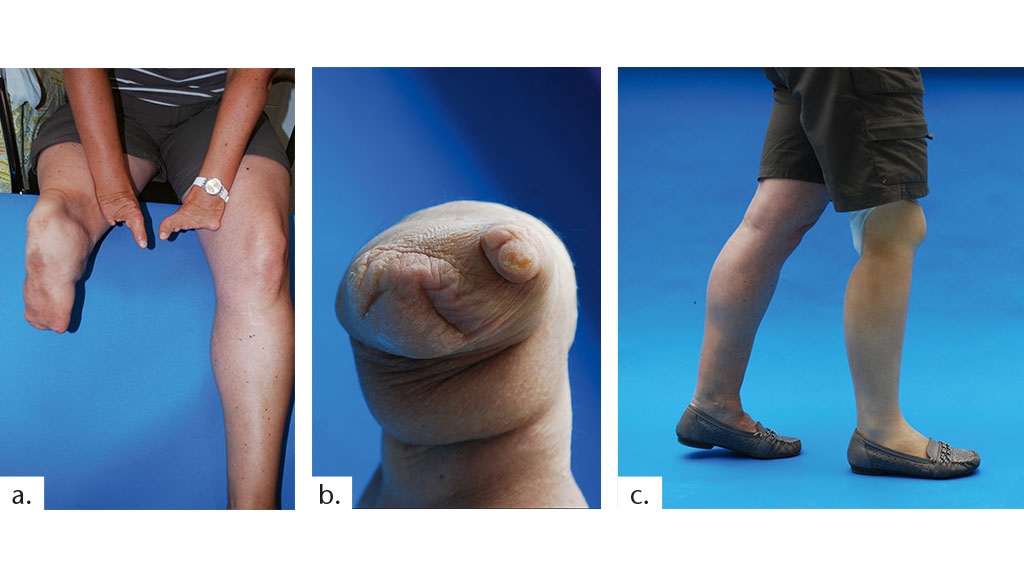 Eine solche Fehlbildung lässt sich erfahrungsgemäß nie standardmäßig versorgen – erst die Flexibilität der Orthopädietechniker sorgte am Ende für eine optimale Versorgung (Abb. 2c). Selbst Skifahren ist damit für die Patientin möglich: Dazu montiert sie eine abnehmbare Oberschenkelhülse auf die Prothese, was ihr mehr Stabilität und Sicherheit im Kniegelenk verleiht. Zudem wurden die Skistöcke an die Dysmelie der beiden Hände angepasst.