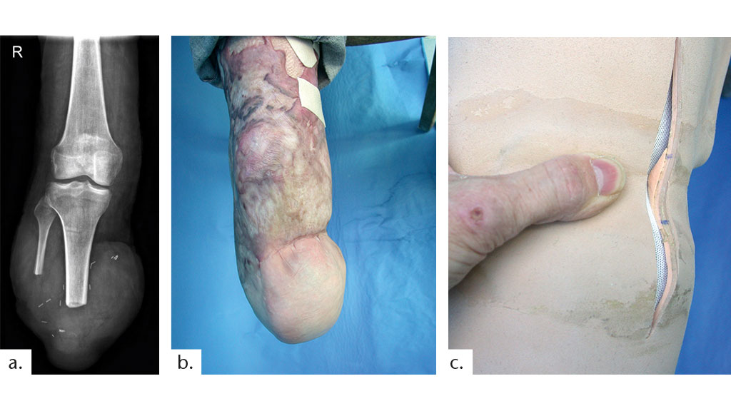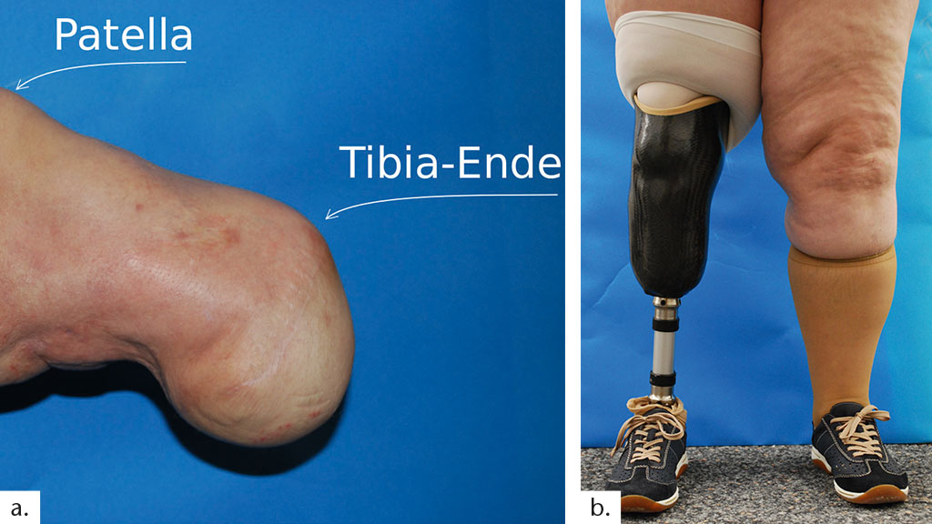 Eine heute 43-jährige Ärztin erlitt im Jahr 2009 einen Fahrradunfall mit einem Lkw. Daraufhin musste der Unterschenkel notfallmäßig amputiert werden. Die besondere Herausforderung ergibt sich bei dieser Patientin aus der Hautsituation am Stumpf: Fast die gesamte Oberfläche des Stumpfes zeigt sich bis in den Oberschenkelbereich stark vernarbt – nur ganz distal befinden sich belastbare Hautareale, die vom Fuß auf den Stumpf transplantiert worden waren. Zudem fehlt ein großer Teil der Oberschenkelmuskulatur, und die Beweglichkeit des Kniegelenkes ist stark eingeschränkt. Auch ist die Weichteildeckung im Bereich Patella und Tibia minimal (Abb. 3a u. b.). Erste Versorgungsversuche in einem Orthopädiezentrum mit Silikonausgleich, Maßliner, Unterdrucksystem und Kniemanschette schlugen fehl: Die Versorgung verursachte bei der Patientin durch Reibung und Druck zusätzliche Hautdefekte, schränkte die Beweglichkeit des Knies stark ein und war zudem außerordentlich schwer. Da die Haut im Kniebereich der Patientin nur eine sehr eingeschränkte Belastung zulässt, wurde seit dem Jahr 2010 versucht, den ganzen Stumpf zu umfassen und gleichmäßig zu belasten. Um dies zu erreichen, wurden im direkten Hautkontakt die Vorteile des Silikons genutzt, um darüber dann einen Softsocket anzupassen. Der Effekt: Die Narben wurden auf diese Weise durch das angepasste Silikon geschützt, die Gefahr einer Pseudarthrose wurde vermindert, und es ist eine bessere Adhäsion der Prothese gegeben. Die Haut am Stumpf ist allerdings nach wie vor sehr dünn. Die Patientin wird deshalb aktuell mit einem simplen Silikonstrumpf und einem Softsocket (Abb. 3c) versorgt. Wenn sich im Tagesverlauf das Volumen ändert, kann die Patientin dies mit einem Nylonstrumpf kompensieren. Die Haut hat sich in den letzten Jahren aber gut entwickelt. Dank des Softsocket-Systems konnte die Patientin ihr Knie immer mehr beugen, was ihre Mobilität verbessert – ein Liner, evtl. noch mit Kniemanschette, würde diese Kniebeweglichkeit behindern. Nun, nach einigen Jahren, kann die Patientin das Knie wieder so weit beugen, dass sie sich normal hinsetzen kann.