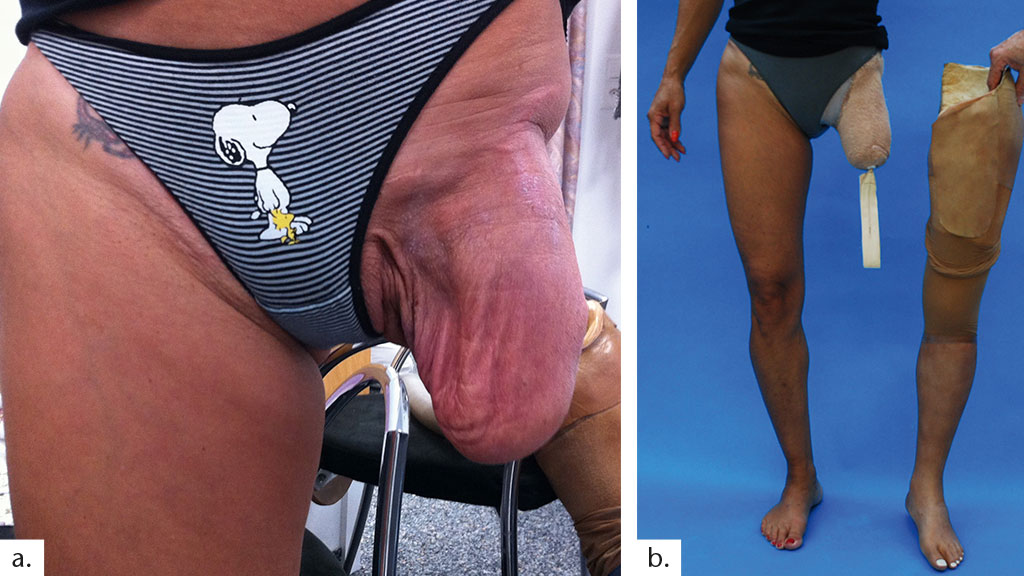 Nach einer Tumorresektion und Bestrahlung als 9‑Jährige entstand ein Ultrakurzstumpf mit nur 4 cm Femurlänge und weitgehender Einsteifung des Hüftgelenkes in Abduktion. Der gesamte Oberschenkelstumpf der heute 49-jährigen Patientin misst 12 cm in der Länge und 25 cm im Umfang. Die Beckenbeinmuskulatur ist völlig atroph. Die Beweglichkeit ist sowohl in Flexion/Extension als auch in Adduktion/Abduktion stark eingeschränkt. Insbesondere im Tuberbereich ist die Haut stark geschädigt und so dünn wie Zigarettenpapier (Abb. 5a). Viele Jahre lang wurde diese Patientin mit einem konventionellen Oberschenkelschaft versorgt. Nach einigen Jahren ertrug die Haut dies jedoch nicht mehr so gut. Die Lösung bestand in einem Maßliner, denn einen konventionellen Liner für solche Maße gibt es nicht. Probleme bestehen allerdings nach wie vor im Bereich des Tubers und im Schritt. Da nun die Probleme der Stabilität und der Haut durch den Maßliner mehr oder weniger gelöst sind, reklamiert die Patientin eine mangelnde Führung durch den kurzen Hebel und damit verbundene Unsicherheiten beim Gehen, die bei der zuvor verwendeten Technik nicht auftraten. Aktuell (Stand: August 2021) scheint es, als sei gemeinsam mit der Patientin ein geeigneter Kompromiss zwischen all diesen Problemen gefunden worden und als sei die Patientin zufrieden mit der jetzigen Lösung (Abb. 5b).