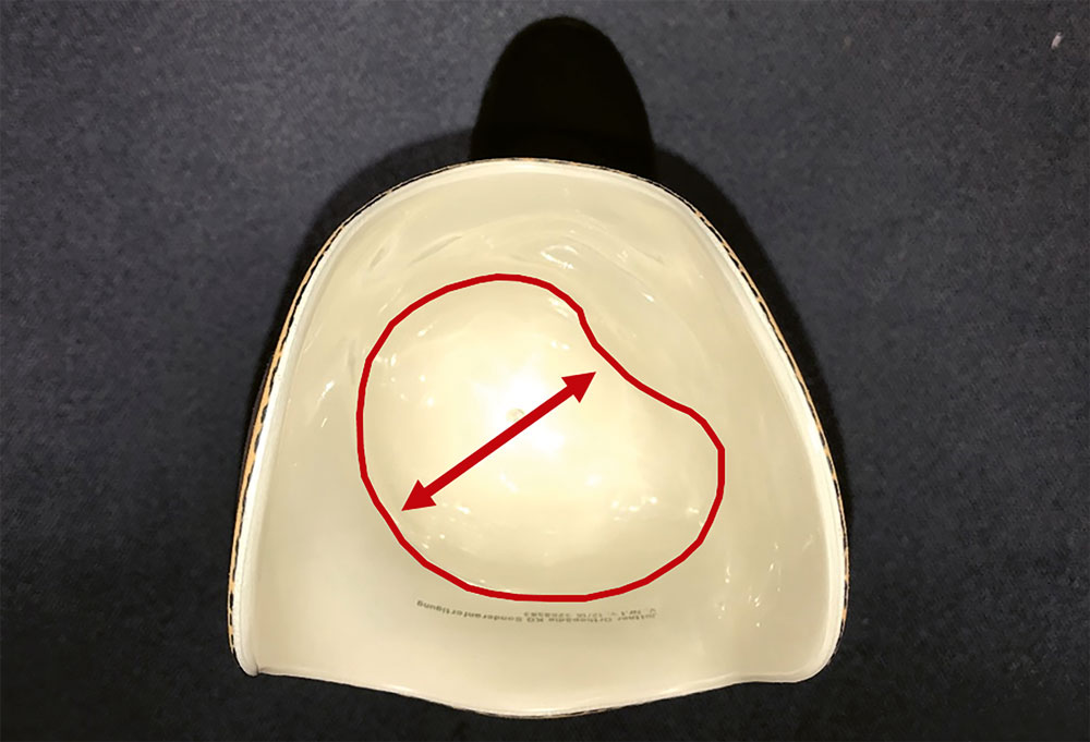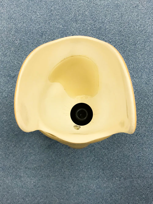 Aus diesen Gründen wurde die Patientin mit einem TPE-Design-Maßliner versorgt, der im distalen Bereich mit Gel aufgebaut ist und zusätzlich einen Pin besitzt (Abb. 10). Diese beiden Zusätze dienen der Hebelverlängerung, um die Steuerung der Prothese zu verbessern. Der Pin hat keine Arretierungsfunktion, um den oben beschriebenen Melkeffekt zu vermeiden. Die Suspension erfolgt über eine Kniekappe in Verbindung mit aktivem Unterdruck. Wie eingangs beschrieben wurde, sollten aufgrund der geringen Fläche alle möglichen Bereiche zur Lastaufnahme einbezogen werden. Daher erfolgte die Schaftgestaltung bei der hier vorgestellten Patientin nach genauer Einbeziehung der anatomischen Strukturen. Der ventrale Tibiabereich ist mit einer maßgefertigten Silikonpelotte ausgekleidet (Abb. 11), um eventuelle Druckspitzen auf die empfindliche Narbenhaut zu minimieren; sie ist nicht dazu gedacht, eine mangelnde Passform zu kompensieren.