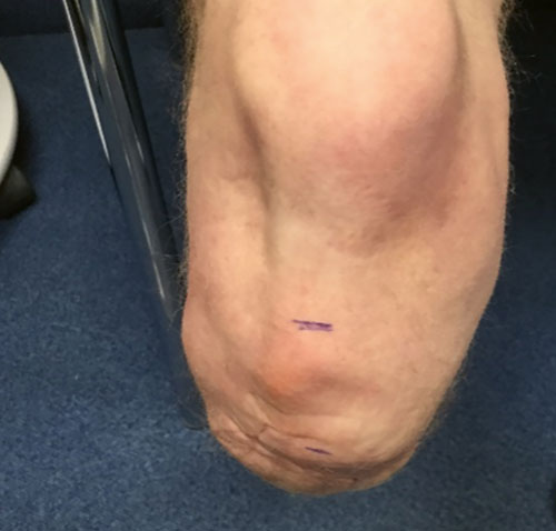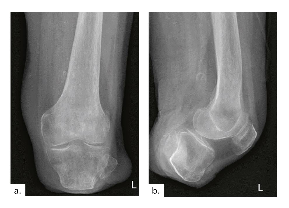 Beim zweiten Fallbeispiel handelt es sich um einen Betroffenen im Alter von 55 Jahren (Mobilitätsgrad 3–4) mit 173 cm Körpergröße bei einem Gewicht von 73 kg. Bei ihm wurde im Alter von 16 Jahren der Unterschenkel aufgrund eines Traumas amputiert. Die Tibialänge beträgt 5,5 cm, die Stumpflänge 6,5 cm mit einer gekürzten Fibula (Abb. 12). Vermutlich aufgrund der Vorversorgungen mit einer PTB-Prothese (PTB = „patellar tendon bearing“) zeigt sich ein Patellahochstand mit daraus resultierender Fehlbelastung und arthrotischer Veränderung. Weil diese Komplikationen als typische Folgen einer PTB-Versorgung anzusehen sind, sollte auf eine solche Versorgung generell verzichtet werden.