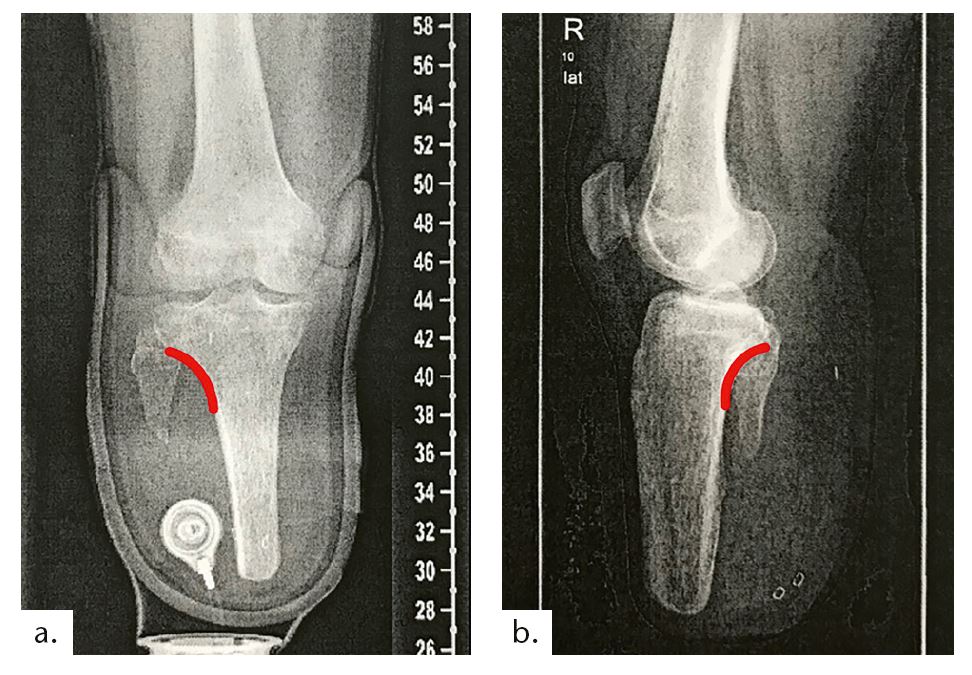 - Tibia mit gebrochener Knochenkante (ultrakurzer Stumpf)