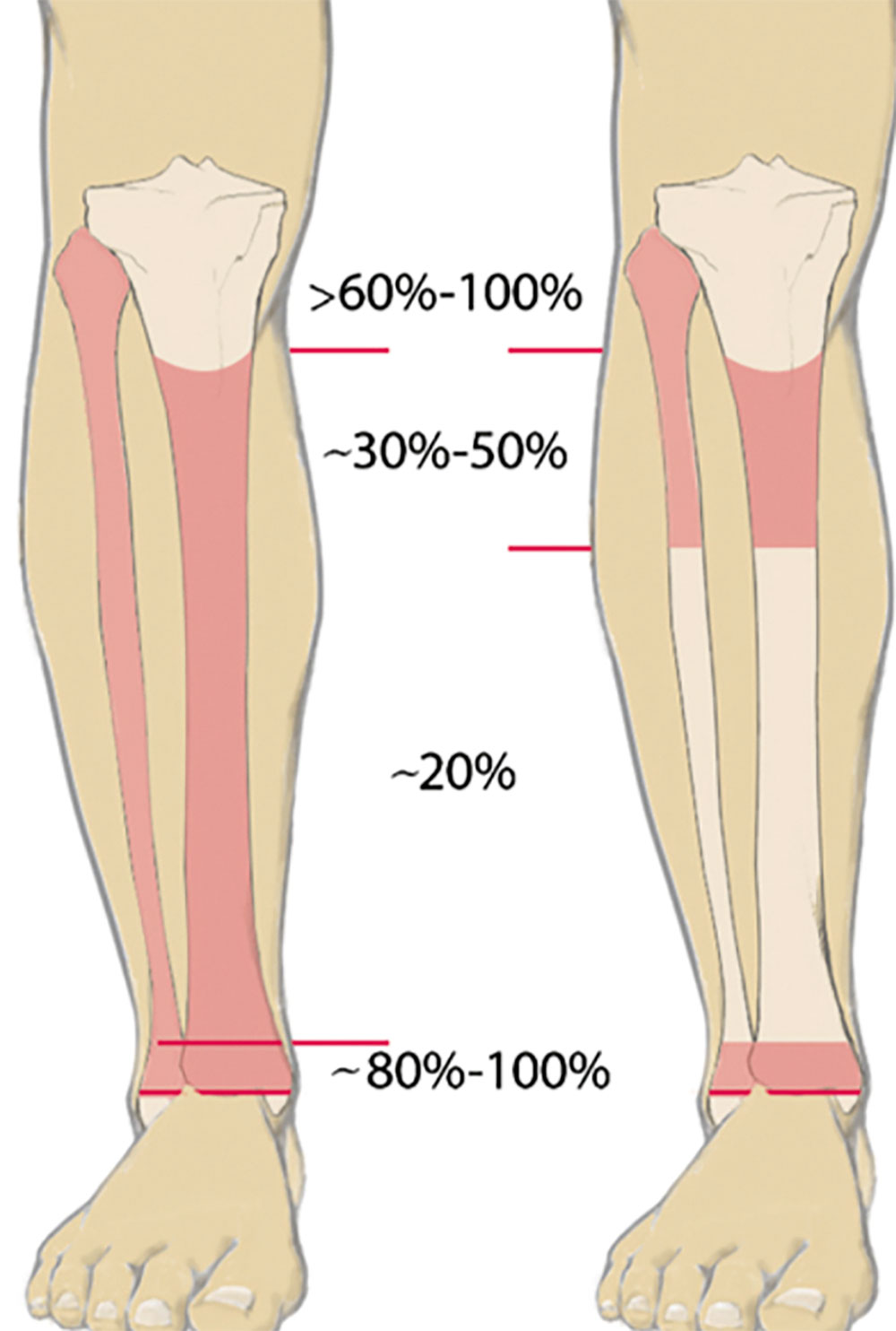 Um eine passgenaue und funktionsfähige Versorgung zu ermöglichen, muss dem Techniker bewusst sein, welche Bereiche des Stumpfes er zur Be- und Entlastung einbeziehen kann. Knöcherne Prominenzen (Abb. 1), eventuelle Neurome und andere empfindliche Areale müssen entsprechend eingebettet werden. Die Bereiche, in denen mehr Weichteile angesiedelt sind, sollten hingegen zur Belastung genutzt werden (Abb. 2). Bei genauerer Betrachtung wird deutlich, dass die Körperlast bei einer Amputation ohnehin nur auf wenige Areale übertragen werden kann. Wenn dann noch ein Amputationsniveau gegeben ist, das relativ weit proximal liegt, verkleinert sich die nutzbare Fläche umso mehr. Aber nicht nur die mangelnde Fläche zur Aufnahme der Körperlast erschwert die Nutzung der Prothese – mit abnehmender Stumpflänge schwindet auch der wirksame Hebelarm zur Steuerung der Prothese. Der Vorteil einer Amputation im proximalen Drittel hingegen zeigt sich bei der erhöhten Stumpfendbelastbarkeit, die bei Amputationen im spongiösen Bereich bei bis zu 100 % liegen kann (Abb. 3). Die roten Bereiche in Abbildung 3 zeigen die geeigneten Amputationsebenen am Unterschenkel – links bei ungestörter, rechts bei gestörter Durchblutung 1.