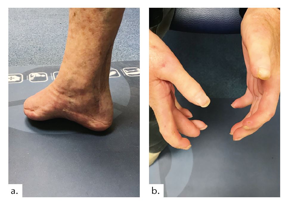 Beim ersten Fallbeispiel handelt es sich um eine 73-jährige Anwenderin (Mobilitätsgrad 2–3), mit einer Körpergröße von 1,53 m und einem Gewicht von 48 kg. Ihre Grunderkrankung besteht in einer Sklerodermie mit daraus resultierender pAVK. Aufgrund dessen wurde im Mai 2014 eine transtibiale Amputation an der linken Seite vorgenommen; eine Revision erfolgte im August 2014. Das Ergebnis ist ein nur 3,5 cm langer Stumpf mit einer Narbenverwachsung am distalen Tibiaende und mit verbliebenem Fibulakopf (Abb. 7 u. 8). An der kontralateralen Seite erfolgte eine Mittelfußamputation (2006); zudem bestehen Einschränkungen der Gelenkbeweglichkeit aller Gelenke mit Greiffunktionsverlust der Hände (Abb. 9). Die besonderen Anforderungen an die Versorgung dieser Patientin ergeben sich aus folgenden Aspekten: