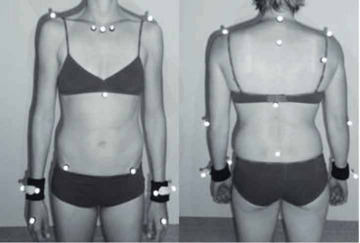 Refektierende Marker (14 mm Durchmesser) wurden gemäß dem Plug-in-Gait-Fullbody-Modell 9 am Körper der Probanden fxiert. Für die Berechnung der einzelnen Gelenkwinkel wurde das Modell durch zusätzliche Marker ergänzt (Abb. 1)