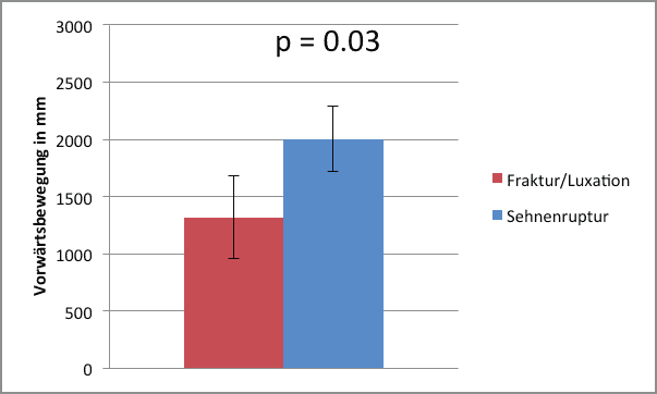 Die Vorwärtsbewegung des gesamten Körpers der Patienten war deutlich geringer (p < 0.001) als bei der Gruppe der gesunden Personen (siehe Tab. 2). Keine der beiden Gruppen zeigte eine Veränderung bei diesem Parameter innerhalb der zweiten Messung.