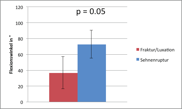 Die maximale Flexion des Ellbogengelenkes war in der Patientengruppe um etwa 26° größer als in der Gruppe der gesunden Probanden. Dieser Unterschied war jedoch nicht signifikant (p = 0.08). Auch zwischen den beiden Messungen zeigte sich kein signifikanter Unterschied