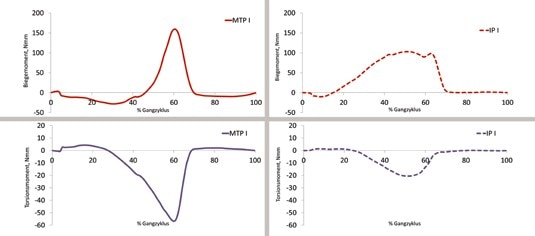Betrach­tet man die Bie­ge- und Tor­si­ons­be­an­spru­chun­gen, so sieht man, dass die höchs­ten Bean­spru­chun­gen an den MTPs (Dor­sal­ex­ten­si­on und Innen­ro­ta­ti­on) zum Ende der Stand­pha­se auf­tre­ten und die MTPs eine Wech­sel­be­las­tung in zwei Ebe­nen (Plant­ar­fle­xi­on vs. Dor­sal­ex­ten­si­on; Außen­ro­ta­ti­on vs. Innen­ro­ta­ti­on) erfah­ren 2021. Die Inter­phal­an­ge­al­ge­len­ke hin­ge­gen erfah­ren eine Dor­sal­ex­ten­si­ons- und Innen­ro­ta­ti­ons­be­an­spru­chung über die gesam­te Stand­pha­se (Abb. 3).