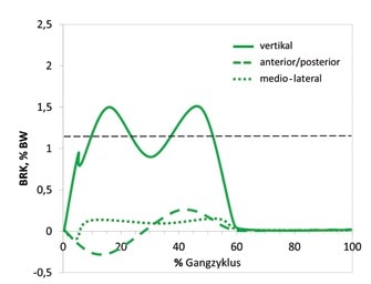 Wenn man von Ent­las­tung im Kon­text ortho­pä­di­scher Ver­sor­gungs­zie­le spricht, ist es zwin­gend not­wen­dig, die exter­nen Belas­tun­gen, die wäh­rend all­täg­li­cher und sport­li­cher Akti­vi­tä­ten auf die mensch­li­chen Bewe­gungs­sys­te­me ein­wir­ken, zu ken­nen, um dann mit dem jewei­li­gen Hilfs­mit­tel in der Ver­sor­gung auf die indi­vi­du­el­le Belast­bar­keits­si­tua­ti­on der Pati­en­ten ziel­ge­rich­tet ein­ge­hen zu kön­nen. Die Boden­re­ak­ti­ons­kraft (BRK) ist die typi­sche exter­ne Belas­tung, die durch die Inter­ak­ti­on von Mensch und Boden auf den Kör­per wirkt. Der ver­ti­ka­le BRK-Anteil ist im Ver­gleich zur anterior/posterior und medio-late­ral gerich­te­ten Kom­po­nen­te am stärks­ten aus­ge­prägt 11 (Abb. 1).