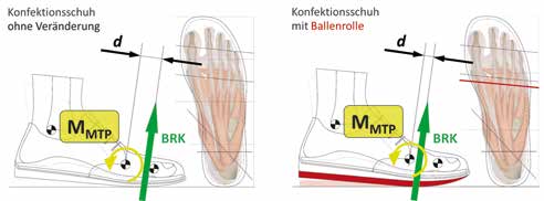 Geht man nun einen Schritt wei­ter und über­legt, wel­che bio­me­cha­ni­schen Grö­ßen durch Bal­len­rol­len haupt­säch­lich beein­flusst wer­den sol­len, um die Ver­sor­gungs­zie­le adäquat umzu­set­zen, so gelangt man schnell zu Ver­än­de­run­gen der Dreh­mo­ment­be­las­tung an den MTPs (Abb. 6). Wie oben erwähnt sind Dreh­mo­men­te die Ursa­che von Dreh­be­we­gun­gen, phy­si­ka­lisch beschrie­ben als Pro­dukt aus Kraft und senk­rech­tem Hebel­arm, und die Belas­tung, die zu Bie­ge­be­an­spru­chun­gen, d. h. Ver­bie­gun­gen, führt. All dies fin­det sich in den For­mu­lie­run­gen der Ver­sor­gungs­zie­le von Rol­len­tech­ni­ken wie­der, z. B. „Kür­zen des Vor­fuß­he­bels“ oder „Ver­rin­ge­rung der Dor­sal­ex­ten­si­on an den MTPs zum Ende der Stand­pha­se“. Betrach­tet man nun Abbil­dung 6, so erkennt man, dass der Abstand d, d. h. der Hebel­arm zwi­schen Gelenk­dreh­punkt und Boden­re­ak­ti­ons­kraft­vek­tor, durch die Bal­len­rol­le redu­ziert und somit das auf­tre­ten­de Moment um die­sen Fak­tor ver­rin­gert wird 31.