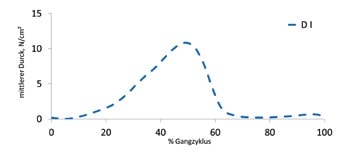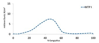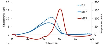 Auch wenn die Bean­spru­chun­gen auf den ers­ten Blick ähn­lich erschei­nen, sind sie völ­lig ver­schie­den und nicht durch die ande­re zu erset­zen. Einer­seits ist beim Druck die Bean­spru­chung senk­recht zur Belas­tungs­flä­che gerich­tet, wohin­ge­gen z. B. bei der Bie­ge­be­an­spru­chung die Belas­tung (Kraft) an der soge­nann­ten Rand­fa­ser tan­gen­ti­al aus­ge­rich­tet ist. Ver­gleicht man ande­rer­seits den zeit­li­chen Ver­lauf z. B. wäh­rend des Gang­zy­klus, so sieht man auch hier ganz deut­lich die Unter­schie­de (Abb. 4): Der plant­are Druck an den unter­schied­li­chen Regio­nen des Vor­fu­ßes steigt von Beginn der Stand­pha­se kon­ti­nu­ier­lich an und erreicht das Maxi­mum bei ca. 50 % des Gang­zy­klus 22. Betrach­tet man den Bie­ge­be­an­spru­chungs­ver­lauf z. B. an MTP I, so erkennt man zunächst eine Abnah­me, d. h. eine Bean­spru­chung in Plant­ar­fle­xi­ons­rich­tung, die dann in der spä­ten Stand­pha­se in eine Dor­sal­ex­ten­si­ons­be­an­spru­chung wech­selt und ihr Maxi­mum bei ca. 60 % des Gang­zy­klus erreicht 23.