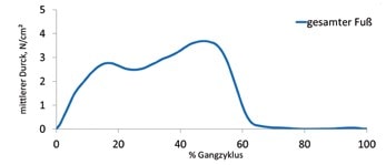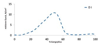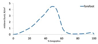 Bis­her las­sen sich in der täg­li­chen Pra­xis Druck‑, Bie­ge- und Tor­si­ons­be­an­spru­chun­gen z. B. mit­tels Innen­soh­len­sys­te­men zwi­schen den unte­ren Extre­mi­tä­ten und den Hilfs­mit­teln erhe­ben 14. Druck­mess­sys­te­me haben in den letz­ten Jah­ren eine wei­te Ver­brei­tung in der täg­li­chen Pra­xis gefun­den und wer­den zur Über­prü­fung ver­schie­de­ner druck­re­du­zie­ren­der oder ‑umver­tei­len­der Hilfs­mit­tel ein­ge­setzt. Rela­tiv neu sind Bie­ge- und Tor­si­ons­mes­sun­gen mit­tels Innen­soh­len­sys­te­men. Dawin und Kol­le­gen zei­gen in ihrem Arti­kel von 2016 das brei­te Spek­trum von Anwen­dungs­fel­dern die­ses Sys­tems auf 15. Ergeb­nis­se plant­a­rer Druck­mes­sun­gen bei gesun­den Per­so­nen, aber auch bei Pati­en­ten mit unter­schied­li­chen ortho­pä­di­schen Beschwer­de­bil­dern am Vor­fuß zei­gen, dass die höchs­ten Druck­be­an­spru­chun­gen im Vor­fuß­be­reich in der spä­ten Stand­pha­se auf­tre­ten 16171819 (Abb. 2).