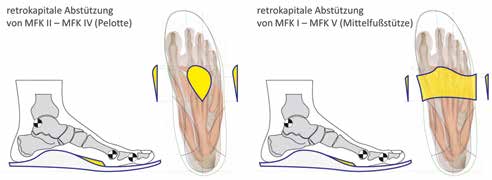 Indi­ka­tio­nen für eine Ver­sor­gung mit­tels retro­ka­pi­ta­ler Abstüt­zun­gen sind ver­schie­de­ne For­men der Meta­tar­sal­gie wie fle­xi­ble, beweg­li­che Spreiz­fü­ße, Hal­lux val­gus und Ham­mer- oder Kral­len­ze­hen. Kon­tra­in­di­ka­tio­nen für retro­ka­pi­ta­le Abstüt­zun­gen wie Pelot­ten sind alle kon­trak­ten und ver­steif­ten Vor­fuß­de­ge­ne­ra­tio­nen und das Dia­be­ti­sche Fuß­syn­drom. Mit retro­ka­pi­ta­len Abstüt­zun­gen wer­den im Wesent­li­chen fol­gen­de Ver­sor­gungs­zie­le angestrebt: