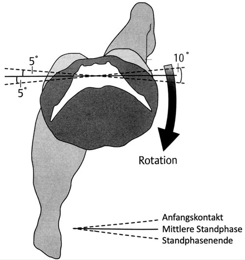 Das Becken durchläuft im Schrittzyklus eine Reihe von Bewegungen: Zur Schwungbeinseite hin senkt es sich um ca. 4 bis 7° kontrolliert ab, um damit die Anhebung des Körperschwerpunktes reduzieren zu können. Verstärkt wird dieser Effekt durch eine gleichzeitige Beckenvorkippung um ca. 4°. Darüber hinaus platzieren die Seitverlagerung des Beckens und die physiologische Valgusstellung des Standbein-Kniegelenkes den Körperschwerpunkt näher über den unterstützenden Fuß (Bodenunterstützungsfläche), um das Gleichgewicht auch im einbeinigen Stand aufrechtzuerhalten. Die transversale Rotation der Hüfte beträgt insgesamt ca. 10°. Dadurch wird eine funktionelle Verlängerung des Schrittes erreicht (Abb. 1).