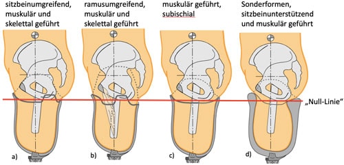 In der vertikalen Schafteinteilung kann der Schaft in drei Ebenen untergliedert werden: Der proximalen Schafteintrittsebene folgt ca. 5 bis 6 cm darunter liegend der Steuerungsbereich. Dessen Größenordnung ist je nach Stumpflänge unterschiedlich; der Schaftendbereich mit dem Vollkontakt schließt die Einteilung ab 2. Als Referenzlinie zur Modell- und Messtechnik dient im Allgemeinen die sogenannte Null-Linie. Diese horizontale Ebene befindet sich direkt unterhalb des Ramus os ischii. Nach distal verlaufend von dieser Linie aus werden die Stumpflänge und das Volumen im Vollkontakt ermittelt. Proximal dieser Linie werden die Zuschnittkriterien für den Randverlauf festgelegt. Die optimale Passform und die gute Haftung des Schaftes tragen dabei im Wesentlichen zur Reduzierung der “StumpfPseudarthrose” bei 3. In Bezug auf die biomechanischen Einflussfaktoren lassen sich die Schaftsysteme in der Schafteintrittsebene in vier Kategorien einteilen (modifiziert nach 4):