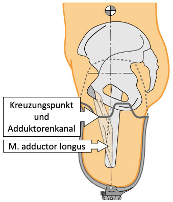 Der Ramus inferior ossis ischii steigt mit dem Ramus inferior ossis pubis (unterer Schambeinast) leicht zur Symphyse an. Diese Situation stellt die Normalstellung des Beckens dar. In der Sagittalebene betrachtet liegen Symphyse und Spina iliaca anterior superior (vordere obere Darmbeinstachel, SIAS) annähernd auf gleicher Höhe. Bei Menschen mit transfemoraler Amputation findet sich allerdings vermehrt eine Beckenvorkippung. Diese lässt neben einer Hyperlordose den unteren Schambeinast nicht genügend steil zur Symphyse ansteigen. Ebenso kann (insbesondere bei Frauen) eine stark ausgeprägte Beckenform die gleiche Situation beim unteren Schambeinast begünstigen. Um eine Kollision des Knochens mit dem Schaftrand zu vermeiden, muss in der Schaftkonstruktion der Kreuzungspunkt (Austrittsstelle des unteren Schambeinastes aus dem Schaft) deutlich freigelegt sein. Annähernd im selben Areal ist der M. adductor longus zu palpieren. Mit seinen Aufgaben der Adduktion, der Unterstützung der Hüftflexion und als Außenrotator besitzt dieser Muskel eine besondere Bedeutung für die Prothesensteuerung. Aus diesem Grund ist es notwendig, auch dort einen Freiraum in Form eines Adduktorenkanals zu schaffen (medialer AP-Vektor). Dieser Kanal kann auch überschüssiges Gewebe aufnehmen, das durch Verdrängung der Weichteile entsteht (Abb. 4). Eine Beckenrückkippung ist dagegen seltener zu beobachten und kann an dieser Stelle der Betrachtung vernachlässigt werden.