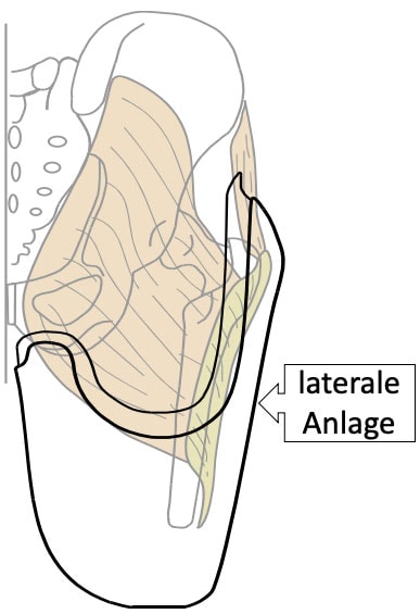 Auf der Außenseite des Schaftes befindet sich die sogenannte laterale Anlage. Diese ist ein flächenhafter oder konkaver Bereich im Verlauf des Femurs nach distal hin (Abb. 5). Durch die Anlage erreicht der Patient:
