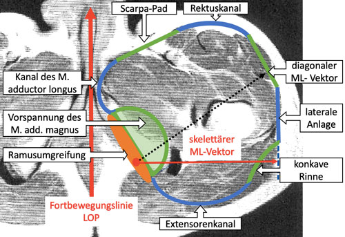 Die Anlage bildet damit zusammen mit der Sitzbein- oder Ramusumgreifung die knöcherne Führung des Schaftes (skelettaler-ML-Vektor); die Verbindung zwischen dem frontal liegenden Kanal des M. rectus femoris und der Vorderkante der außenliegenden lateralen Anlage wirkt als Gegenpart der Ramusumgreifung und verhindert das Abgleiten des Sitzbeins in den Schaft (diagonaler ML-Vektor). Zwischen der lateralen Anlage außen und dem Kanal der extendierenden Muskulatur dorsal befindet sich ein flacher Bereich oder eine konkav gestaltete Rinne entlang der Femurhinterkante. Dieses Areal unterstützt die Stabilisierung des Femurs und verhindert das Einströmen von Luft (Abb. 6).