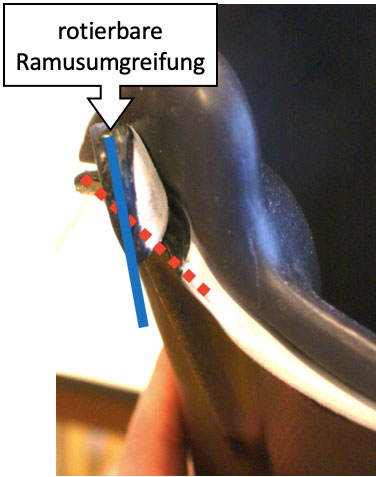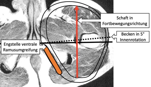 Ein Konflikt entsteht bei der Betrachtung der transversalen Beckenrotation. Denn die Ramusumgreifung aller anatomischen Schaftformen folgt im Verlauf dem Winkel des Ramus inferior os ischii zur Fortbewegungslinie (LOP). Mit der Vorwärtsrotation des Beckens um ca. 5° rotiert schlussendlich auch der Schaft. Um ein Abweichen von der Laufrichtung zu vermeiden, benötigt der Schaft einen Freiraum von 5 bis 10 mm zwischen Ramusumgreifung und Sitzbein, damit es zu weniger Druckspitzen kommt, wenn sich der Oberschenkel am Ende der Schwungphase in Fortbewegungsrichtung ausrichtet, das Becken dabei aber innenrotiert stehen bleibt (Abb. 7). Empfehlenswert ist in diesem Fall eine Ramusumgreifung, die eine begrenzte Rotation zulässt (Schäfer, 2010) 19. Somit wird die Druckerhöhung vermindert, der Komfort dagegen erhöht (Abb. 8 u. 9). Zur Aufrechterhaltung der Gehrichtung ist zusätzlich eine Außenrotation von ca. 5° der Knie- und Fußkomponente notwendig.