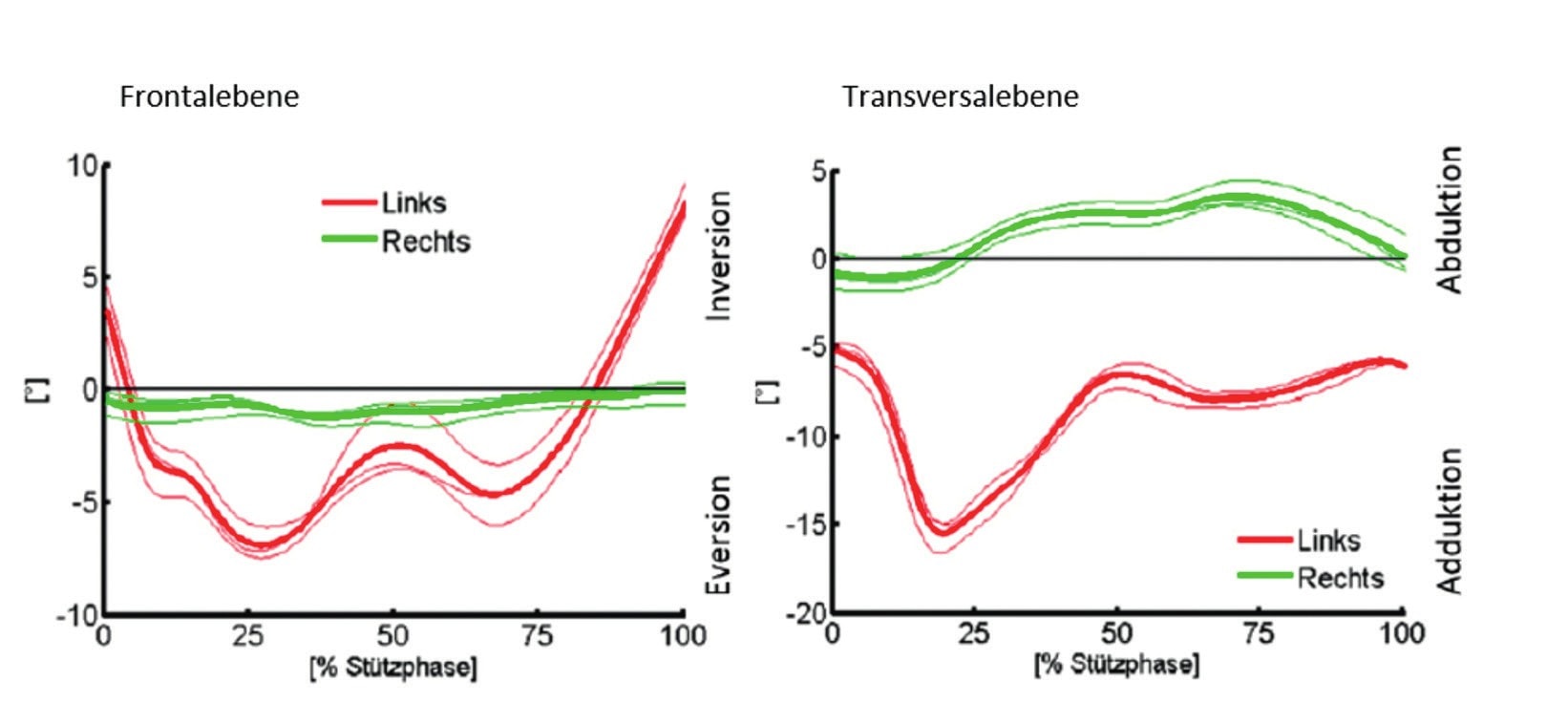 In der Sagittalebene während der Standphase (d. h. Stützphase) des normalen Gehens zeigen sich deutliche Unterschiede in der Bewegung des Sprunggelenks (Plantarflexion/Dorsalextension) und des Kniegelenks (Flexion/Extension) zwischen der freien linken und der per Walker immobilisierten rechten unteren Extremität (Abb. 2): Während die Bewegung des Sprunggelenks nachhaltig durch die Walker eingeschränkt wird, erscheint die Bewegung des Kniegelenks in der Sagittaleben nahezu unbeeinflusst. Auch in der Frontal- und Transversalebene wird die Rückfußmobilität deutlich durch die Walker-Orthesen eingeschränkt (Abb. 3). Im Vergleich der drei Walker findet sich nahezu kein Unterschied in den Sprunggelenksbewegungen des nicht versorgten kontralateralen Beines. Dagegen zeigen sich deutliche Unterschiede zwischen den Walkern an der versorgten Seite (Tab. 1), wobei der „Rebound Air Walker“ von Össur im Durchschnitt über alle Ebenen die größte Stabilität vermittelt.
