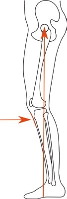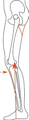 Eine Teilentlastung kann zum Beispiel dann erforderlich werden, wenn das Bein wegen einer Bewegungseinschränkung in Knie- oder Hüftgelenk in einer flektierten Grundposition steht. Durch die Flexion verläuft der Belastungsvektor hinter dem Knie und erzeugt über die gesamte Standphase ein beugendes Moment. Diesem flektierenden Moment muss die Orthese ein extendierendes Moment entgegensetzen, das über die ventralen, kniegelenksnahen Anlageflächen auf das Knie übertragen wird (Abb. 4). Selbst wenn dort großflächige körperkongruente Anlageflächen geschaffen werden, kann dies bei stärkeren Beugestellungen dazu führen, dass die Drucktoleranz der Haut oder die Schmerztoleranz des Patienten überschritten werden. Wird dann ein Teil der Gewichtskraft über den Tuberaufsitz in die Orthese eingeleitet, erhöht sich zwar die mechanische Belastung der Orthese – gleichzeitig reduziert sich jedoch das beugende Moment, das auf die Beinachse wirkt. Dadurch ist auch das erforderliche extendierende Moment durch die Orthese geringer, und die benötigte Kraft an den vorderen Anlageflächen wird so weit reduziert, dass sie vom Patienten toleriert werden kann (Abb. 5).