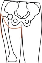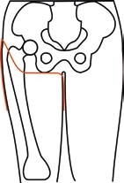 Sinnvoll eingesetzt werden kann der Tuberaufsitz auch bei einer Schwäche der abduzierenden Muskulatur der Hüfte (Abb. 6). Diese führt in der Einbeinunterstützung zum Absinken des Beckens zur Gegenseite („Trendelenburg-Zeichen“), das in der Dynamik durch ein Seitpendeln des Oberkörpers ausgeglichen werden muss („Duchenne-Hinken“). Wird dies vom Patienten nicht toleriert, besteht die Möglichkeit, mit der Verwendung eines Gehstocks die Unterstützungsfläche so weit zu vergrößern, dass ein Seitpendeln des Oberkörpers nicht mehr notwendig ist, um das Lot aus dem Körperschwerpunkt über die Unterstützungsfläche zu bringen. Die grundlegende Problematik – das Absinken des Beckens – bleibt dabei jedoch erhalten; lediglich die Auswirkungen werden kompensiert. Hier kann der Tuberaufsitz ursächlich eingreifen. Betrachtet man die Anatomie des Beckens in der Frontalebene, so fällt auf, dass der Tuber os ischii weiter medial liegt als das Drehzentrum der Hüfte. Kippt also das Becken um den Drehpunkt der Hüfte ab, so senkt sich dabei der Tuber os ischii ab. Dieses Absenken kann durch den Tuberaufsitz verhindert werden (Abb. 7). Damit wird das Trendelenburg-Zeichen verhindert, und somit ist auch kein kompensatorisches Duchenne-Hinken erforderlich.