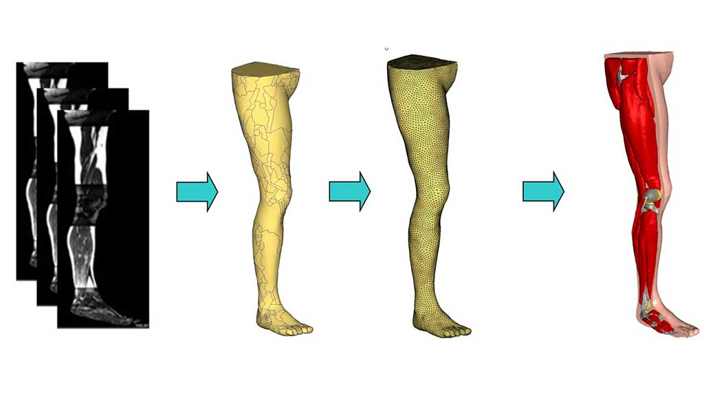 Anschließend erfolgte die Selektion der unterschiedlichen Gewebearten (Haut/Fettgewebe, Muskeln, Knochen, Sehnen, Bänder und Knorpel) sowie deren Oberflächenrückführung mithilfe von 3D-Rekonstruktionstools, auf deren Basis dann mittels der Finite Elemente Methode (FEM) das digitalisierte Beinmodell generiert werden konnte (Abb. 1b bis d).