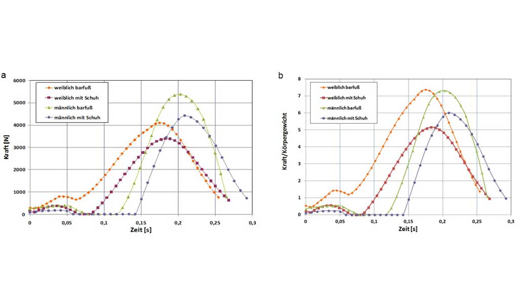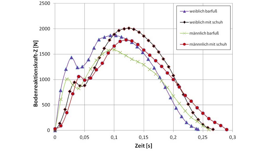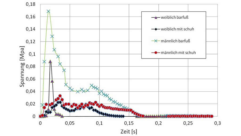 Der Vergleich der Spannungsspitzen im Fersenpolster mit den jeweiligen Bodenreaktionskräften (Abb. 11) zeigt deutlich, dass die maximalen Spannungen zu den Zeitpunkten der maximalen Bodenreaktionskräfte während der Belastungsantwort (erste Kraftspitze) auftreten, allerdings mit Ausnahme des weiblichen Barfuß-Modells, was wieder auf den Vorfußlauf zurückgeführt werden kann. Die Modellrechnungen mit Schuhen zeigen eine deutliche Spannungsreduzierung gegenüber den Barfuß-Modellen. Dieses Phänomen lässt sich durch die passende und optimierte Form des Schuhs zur Fußsohle und die Dämpfung des Aufprallstoßes der Schuhsohle erklären.
