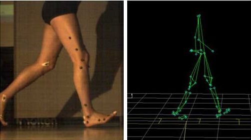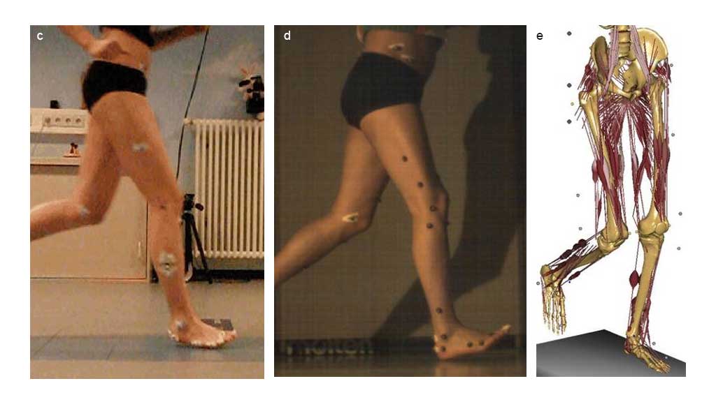 Für die Generierung der Finite Elemente (FE)-Modelle und für die spätere Berechnung der Interaktionen Fuß/Schuh/Unterlage beim Abrollvorgang des Fußes wurden Bewegungsanalysen (Video-High-Speed-Daten) kombiniert mit Bodenreaktionskraftmessungen durchgeführt. Dabei wurden charakteristische Positionen auf der Hautoberfläche des Probanden mit Markern versehen, welche beim Laufen (jeweils barfuß und mit Joggingschuhen mit der Laufgeschwindigkeit von 2,8 m/s) die erforderlichen Signale für die kinematischen Daten lieferten (Abb. 2). Auf Basis der in Form von Human Motion Capture (HMC)-Daten und der gemessenen Bodenreaktionsdruckkräfte erfassten kinematischen und kinetischen Daten erfolgten die späteren numerischen Berechnungen zu den Interaktionen 5.