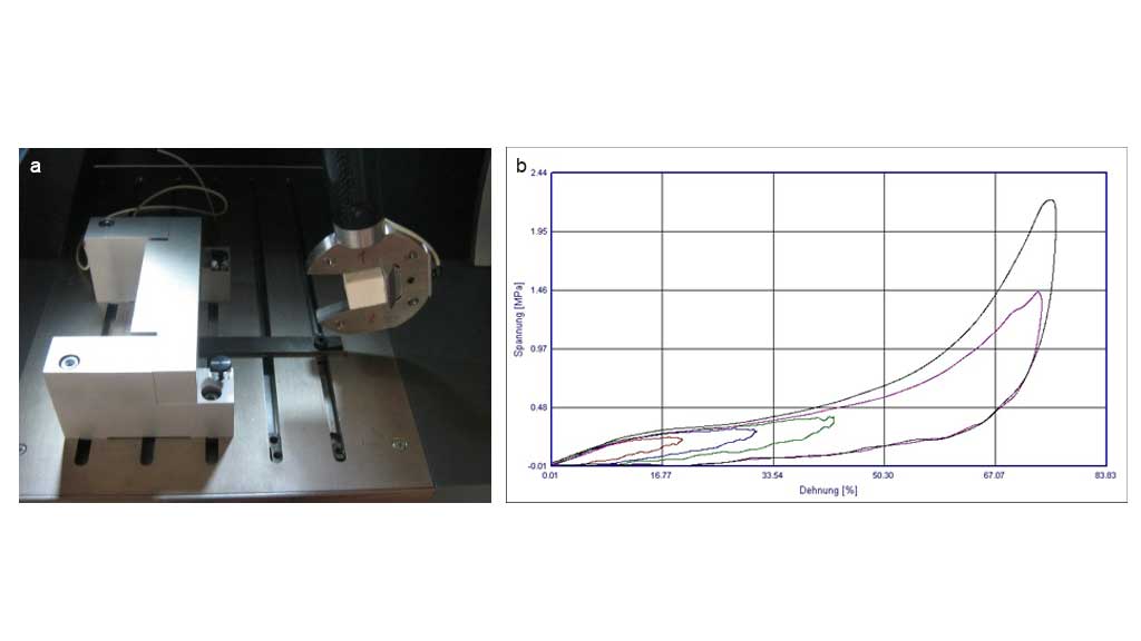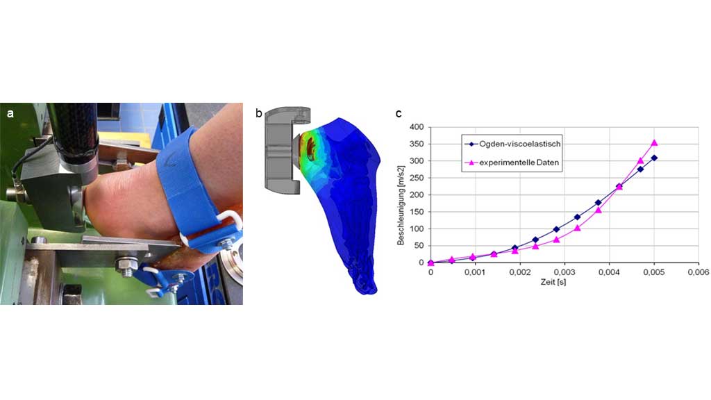 Zur Gewinnung adäquater dynamischer in vivo-Materialeigenschaften des Fersenpolsters der Probanden wurde eine Pendelschlag-Vorrichtung zur Messung der Beschleunigungs-Zeit-Daten beim Impact entwickelt. Um die Elastizität der Fixationsvorrichtung des Fußes und damit möglicherweise verbundene Messfehler minimieren zu können, wurden individuelle Fixationsschalen aus Fiberglas kombiniert mit Edelstahl angefertigt. Auf Basis der Messdaten erfolgte dann mithilfe eines numerischen Optimierungsalgorithmus und der inversen FEM die Identifizierung der dynamischen Materialparameter des Fersenpolsters mittels eines geeigneten Materialgesetzes linear-viskoelastischer nicht-linear-hyperelastischer Materialien (Abb. 3) 6 7 8 9 10 11. Zur Beschreibung der Fettgeweberegionen des Sohlenbereiches und des Fußballens wurden im Rahmen einer ersten Näherung dieselben Materialparameter verwendet.