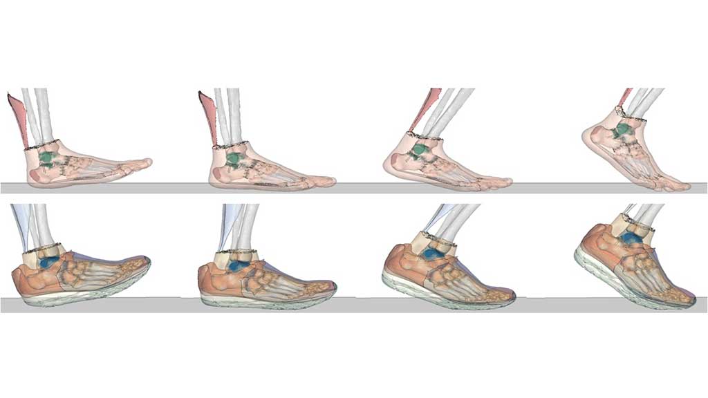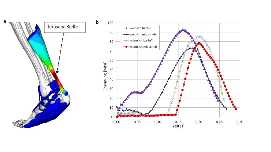 Mithilfe der Software AnyBody wurden die in der Achillessehne auftretenden Kräfte während der Standphase am Beispiel eines weiblichen und männlichen Probanden jeweils mit Schuh und barfuß berechnet und an die FE-Modelle ausgegeben. Bei AnyBody handelt es sich um eine Mehrkörpersimulations-Software zur Abbildung vor allem der menschlichen Skelettmuskulatur (ohne Berücksichtigung von Weichgewebestrukturen in Form von Fett-Muskel-Verbünden) bei diversen Bewegungszuständen. Die Software ist speziell für die Rückwärtsberechnung (inverse Dynamik) von Gelenkreaktionen und Muskelkräften konzipiert, wobei auf Basis definierter Bewegungsdaten und Randbedingungen des Modellsystems die Bestimmung von Muskelaktivitäten und daraus resultierender Gelenkkräfte ermöglicht wird.