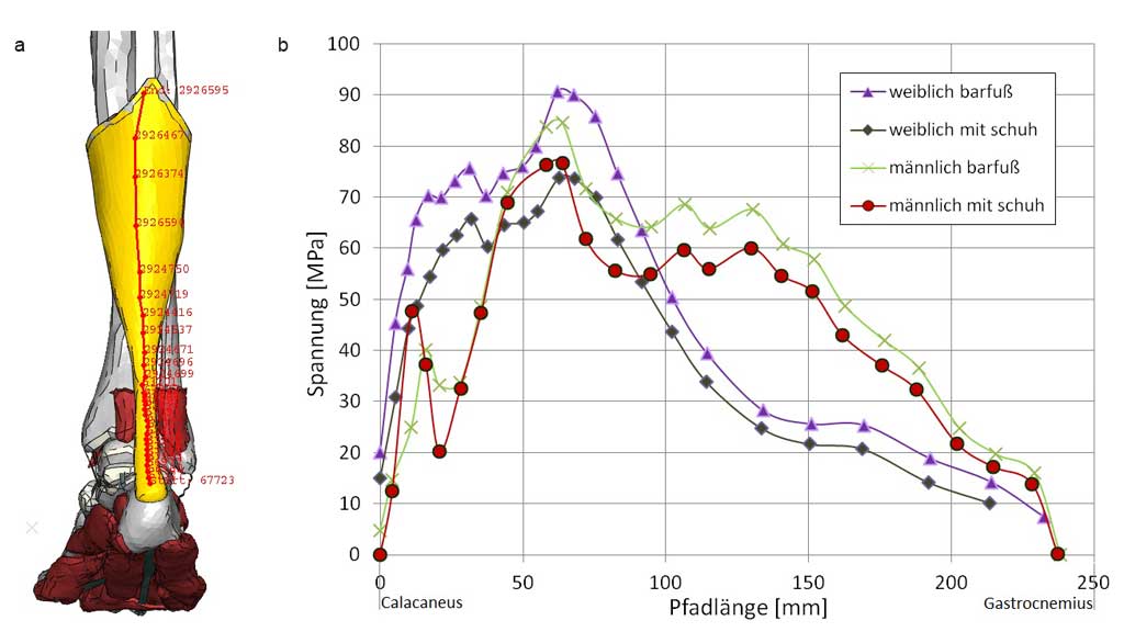 Um die Spannungen im Inneren der Achillessehne aufdecken zu können, wurde ein Knotenpfad von der Insertion am Calcaneus bis zum Gastrocnemius definiert (Abb. 7a). Hierbei wurde die von MISES-Spannung*) aller FE-Modelle bei maximaler Achillessehnenkraft in einem Diagramm dargestellt (Abb. 7b). Die maximalen Spannungen aller FE-Modelle treten etwa 60 mm oberhalb der Insertion der Achillessehne am minimalen Querschnitt auf (in vielen Publikationen als „kritische Stelle“ bezeichnet) (Abb. 8a). Es ist festzustellen, dass, obwohl die Kräfte in der Achillessehne beim weiblichen FE-Modell kleiner als diejenigen beim männlichen Modell sind, die Spannungen an der kritischen Stelle des weiblichen Achillessehnenmodells größer sind (siehe Abb. 7b). Dies kann einerseits auf die kleinere Querschnittfläche der weiblichen Achillessehne mit 46 mm2 im Vergleich zur männlichen Achillessehne mit 55 mm2 und andererseits auf den Laufstil der Probandin mit leichter Überpronation zurückgeführt werden.