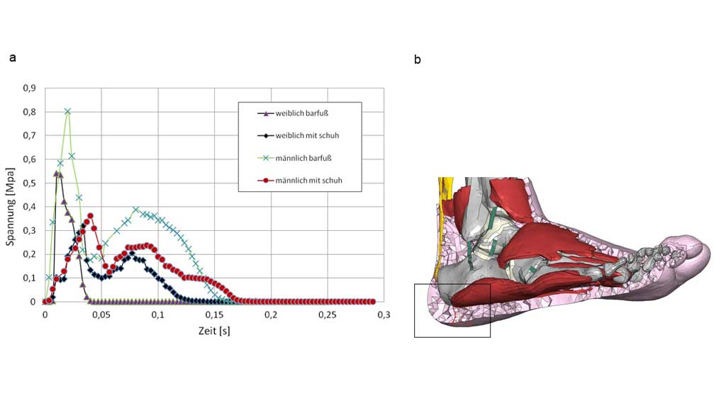 Für die FE-Berechnungen der dynamischen Interaktionen zwischen Fuß, Schuh und Untergrund bzw. zwischen Fuß und Untergrund während der Standphase wurde der ABAQUS-Solver „explicit“ angewandt. Hierzu wurden die aus den Ganganalysen gewonnenen kinetischen und kinematischen Daten, die Materialparameter aller Komponenten sowie die mithilfe der AnyBody-Software berechneten Achillessehnenkräfte den FE-Modellen zugeordnet. Die Auswertung der Ergebnisse fokussiert auf die mechanischen Spannungen in der Achillessehne und im Fersenpolster, sodass aus Gründen möglichst kleiner Rechenzeiten die im FE-Beinmodell enthaltenen Knochen in vereinfachter Weise als Starrelemente definiert wurden. Eine weitere Vereinfachung der FE-Modelle erfolgte durch die Entfernung der Muskel- und Fettgewebe in den Unterschenkel- und Oberschenkelregionen.