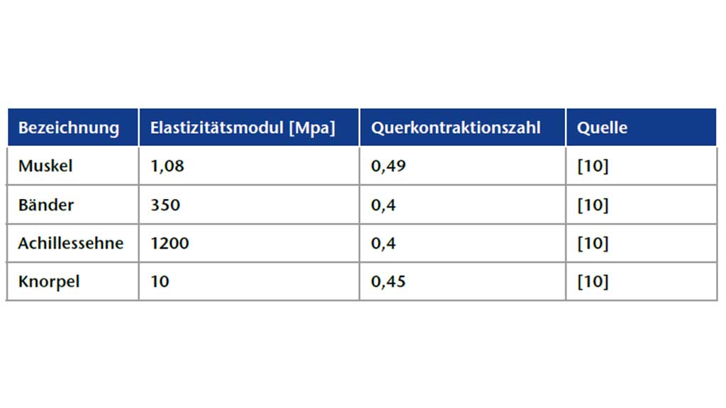 Die weiteren Materialparameter, solche humane Weichgewebestrukturen betreffend wie etwa Bänder, Knorpel, Sehnen und Muskeln, wurden im Rahmen der vorliegenden Betrachtung der einschlägigen Literatur 12 entnommen (Tab. 1). Obwohl das biologische Verhalten von Weichgewebe nach dem Stand von Wissenschaft und Technik a priori viskoelastischer und meistens nicht-linear elastischer Natur ist, konnten keine dieses Verhalten abbildenden Materialparameter in der Literatur recherchiert werden. Vielmehr beschränken diese sich lediglich auf linear-elastisches Materialverhalten.