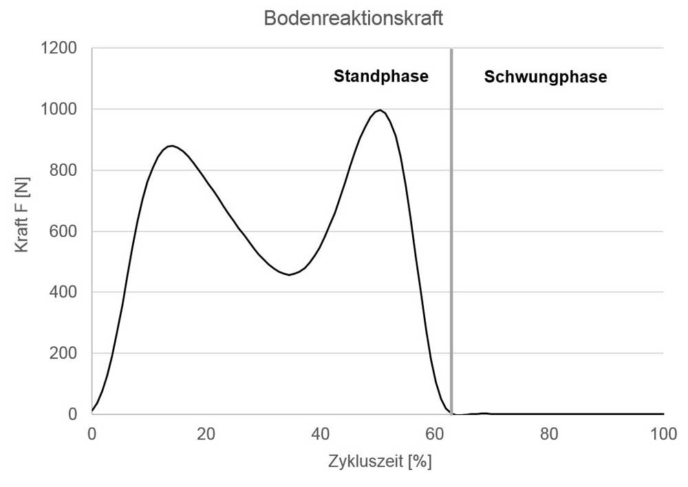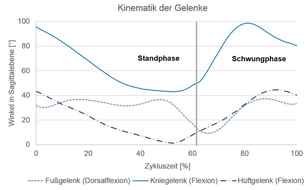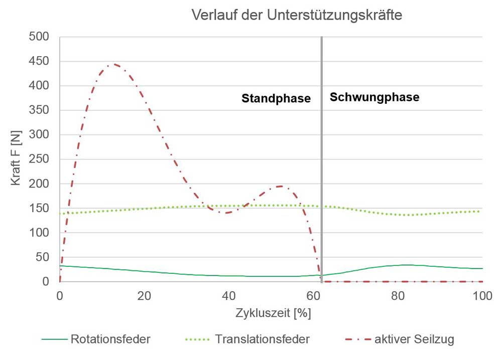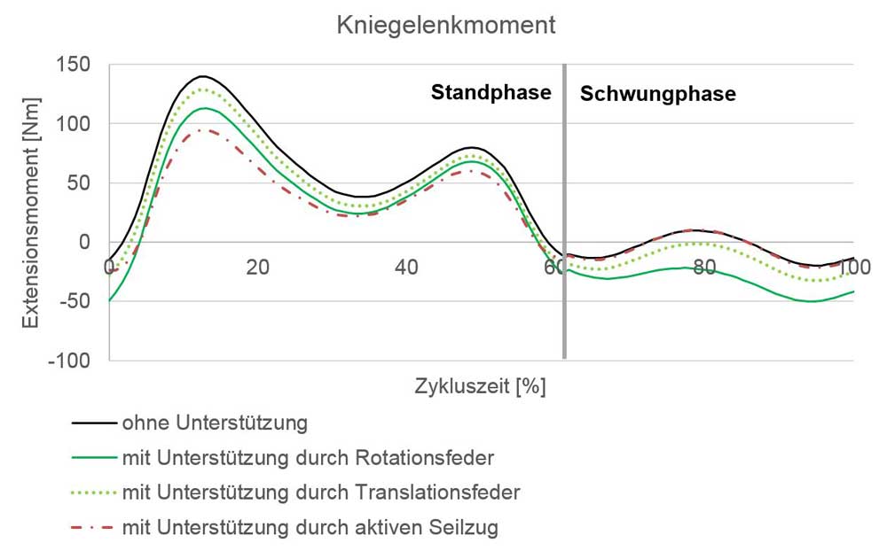 In der Standphase kommt es zur Gewichtsakzeptanz sowie zum einbeinigen Hochdrücken des gesamten Körpers. Der Momentenverlauf ohne Unterstützung weist in dieser Phase zwei Peaks auf. Beim Übergang von der Stand- in die Schwungphase geht der Verlauf von einem positiven in einen negativen Bereich über. In der Schwungphase gibt es keine signifikanten Peaks, da in dieser Phase lediglich die Masse der im Schwung befindlichen Unterschenkel- und Fußsegmente Einfluss auf das Kniegelenkmoment hat. Der erste Peak der Standphase erreicht das Maximum von 140 Nm nach ca. 10 % der gesamten Zykluszeit. Bei 50 % der Zykluszeit tritt beim zweiten Peak ein Wert von 80 Nm auf. Der qualitative Verlauf des Kniegelenkmomentes ist für alle Verläufe in der Standphase identisch. Der erste Peak kann durch eine Translationsfeder um 11 Nm, durch eine Rotationsfeder um 27 Nm und durch den aktiven Seilzug um 45 Nm reduziert werden. Der zweite Peak wird durch die Translationsfeder um 12 Nm, durch die Rotationsfeder um 7 Nm und durch den aktiven Seilzug (Motor) um 20 Nm reduziert. In der Schwungphase bleibt der Verlauf bei dem Einsatz der aktiven Unterstützung unverändert. Dagegen ändert sich der quantitative Momentenverlauf durch die passiven Elemente: durch die Rotationsfeder um 33 Nm und durch die Translationsfedern um 11 Nm.