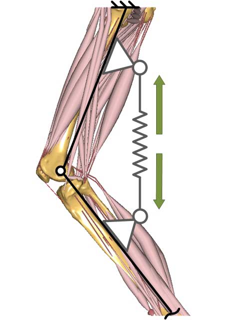 Die passive Unterstützung erfolgt durch die Rotations- beziehungsweise Translationsfeder über den gesamten Bewegungszyklus. Die Federkräfte wurden in Abhängigkeit des Kniewinkels implementiert. Die Translationsfeder wurde zum einen in einem Abstand von 0,087 m vom distalen Ende des Femurs an diesen angebunden; zum anderen erfolgte eine Anbindung an die Tibia in einem Abstand von 0,093 m vom proximalen Ende.