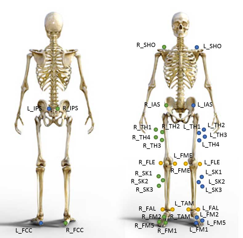 Für die kinematischen Daten wurde ein markerbasiertes Bewegungsaufnahmesystem (Qualisys AB, Göteborg, Schweden), bestehend aus zwölf aktiven im Raum verteilten Infrarotkameras, verwendet. Basierend auf dem Cast-Modell 5 (Abb. 1 u. 2) und der Ergänzung zweier Marker an der Schulter wurden insgesamt 36 passive Infrarotmarker angebracht; zusätzlich wurden für die statische Aufnahme zur Bestimmung der Gelenkachsen und Segmentlängen weitere acht Marker medial und lateral am Knie- und Fußgelenk beider Beine befestigt. Die Datenaufnahme der Kinematik erfolgte mit 100 Hz, die der Kinetik mit 500 Hz. Zur Aufnahme und Synchronisation wurde die Software “Qualisys Track Manager” verwendet. Lücken in den Trajektorien wurden durch Interpolation vervollständigt, wobei maximal zehn zusammenhängende Frames ergänzt wurden.