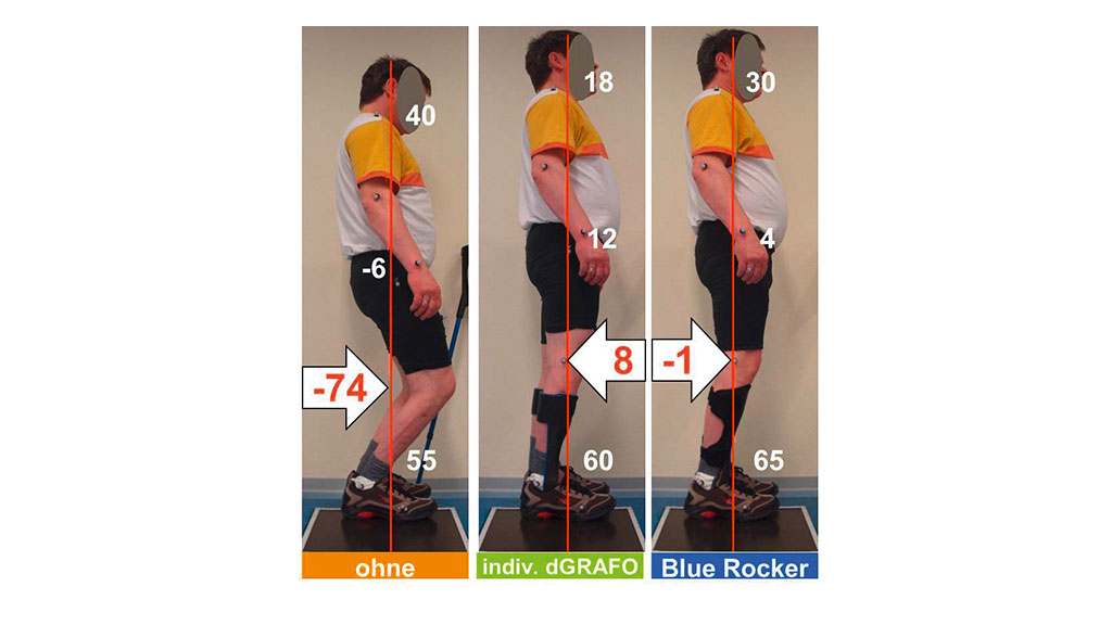 Grundsätzlich deutete sich an, dass es sinnvoller scheint, den Winkel des oberen Sprunggelenkes auf den Patienten abzustimmen, als die statische Belastungslinie mittels der Verkippung einer vordefinierten Unterschenkel-Fuß-Position zu beeinflussen. Im letzteren Fall scheint die Adaption des Bewegungsapparates deutlich schwieriger, da sie nicht der Haltungsregulation am oberen Sprunggelenk entspricht. So war während der Anpassung der Blue Rocker-Orthese die Grenze der knieextendierenden Optimierungsmöglichkeit erreicht. Die Patienten drohten nach hinten zu fallen, obwohl sich die Belastungslinie noch nicht im Bereich der Normalwerte befand.