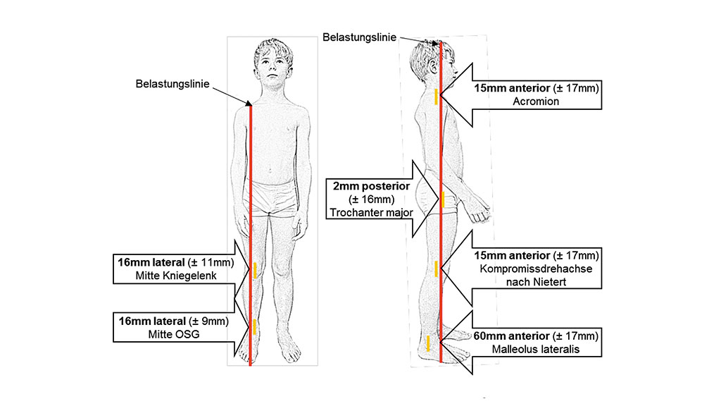 Die Objektivierung des Stehens sowie die Justierung des Orthesenaufbaus erfolgte mit dem Statikmessgerät L.A.S.A.R. Posture (Ottobock, D). Für die Einschätzung der Messwerte wurden die Daten gesunder Gruppen genutzt (Abb. 1). Die optimierte Statik, sowohl in der Sagittalebene als auch in der Frontalebene, stellte die Grundlage der Versorgungsprozesse mit beiden Orthesen-Typen dar.