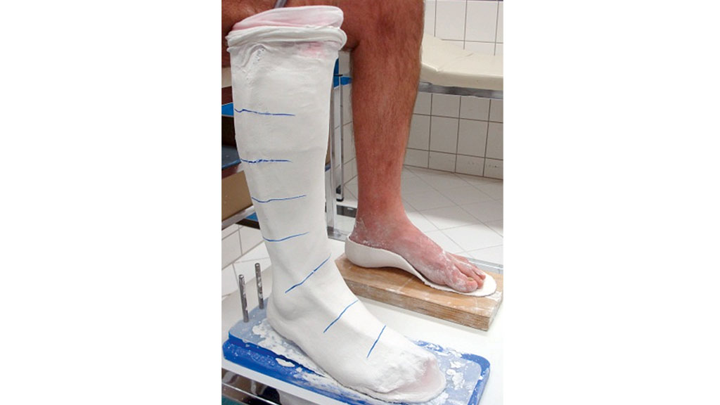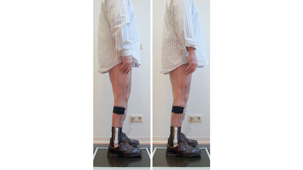 Die Herstellung begann mit der Gipsnegativabnahme unter Berücksichtigung der effektiven Absatzhöhe der später verwendeten Schuhe (Abb. 2). Es folgte die Modellierung der Gipspositive, auf denen dann aus thermoplastischem PET-Kunststoff Testorthesen gefertigt wurden. Neben der Kontrolle und Optimierung der Passform war das Hauptziel der Testorthesen, den Winkel des OSGs individuell einzustellen. Hierzu stand der Proband auf dem L.A.S.A.R. Posture. Mithilfe der Einstellschrauben an den Doppelanschlag-Knöchelgelenken der Testorthesen wurde der OSG-Winkel so justiert, dass sich die Belastungslinie mit dem physiologischen Mittelwert von ca. 15 mm anterior vom Kniedrehpunkt befand (Abb. 3). Im Anschluss folgte die dynamische Anprobe mit Nachjustierungen und Festlegung der Sohlenelastizität durch Beschleifen der Sohlenunterfläche.